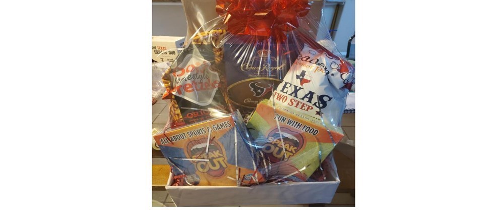 Crown Royal special addition (Texans) with leather embossed bag, Dots gourmet pretzels, Texas Gourmet popcorn and funs games for the entire family including table top miniature golf game complete with 6 shots glass holder. 1Bottle of Crown Royal 1 Bag of gourmet pretzel 1bag of gourmet popcorn Table top miniature golf game with 6 shot glasses and holder Retail Value $100